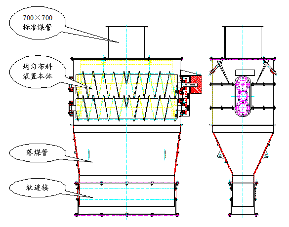 在布料裝置的實際使用當中,我們發現在設備的使用當中存在這嚴重堵煤的現象,大量的煤粘結在主轉子上埋沒絞籠,使整個轉子變成一根毫無作用的圓筒,無法均勻布料,于是我們在此經驗基礎上進行優化設計,在原設備上加裝了一根從動轉子,使從動轉子與主轉子同步運行,同時從動轉子的絞籠插到主轉子絞籠內,在轉動的過程中,利用從動轉子的絞籠將粘結在主轉子絞籠內的煤除掉,達到了防止布料裝置堵煤的特殊效果。